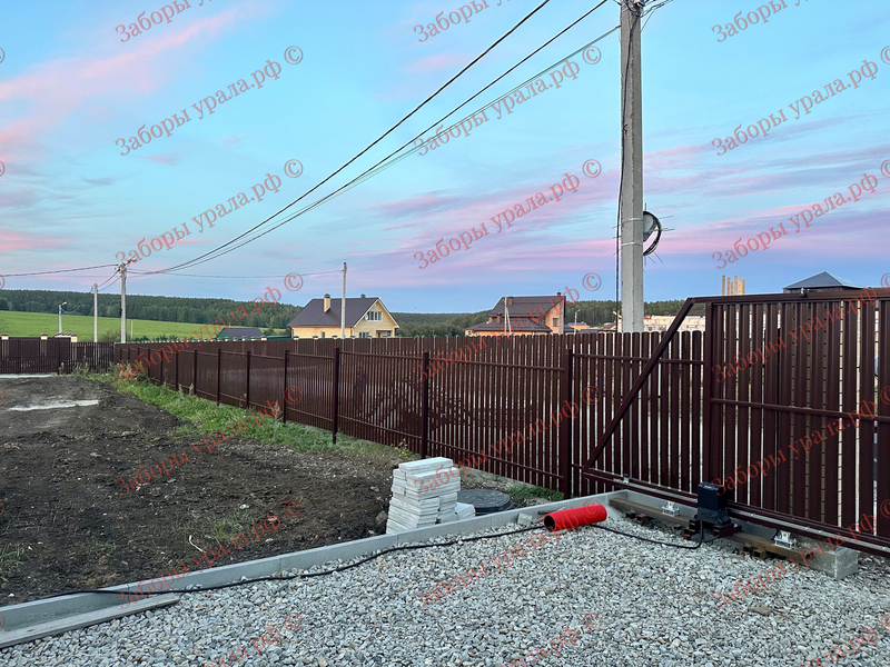 Проект включал монтаж забора из металлического штакетника протяженностью 140 метров и установку откатных ворот с кирпичными столбами.